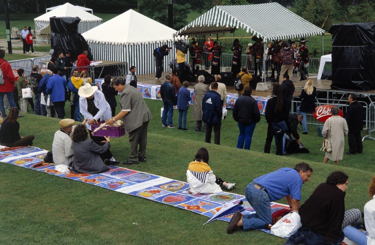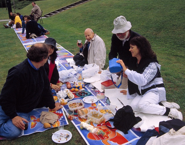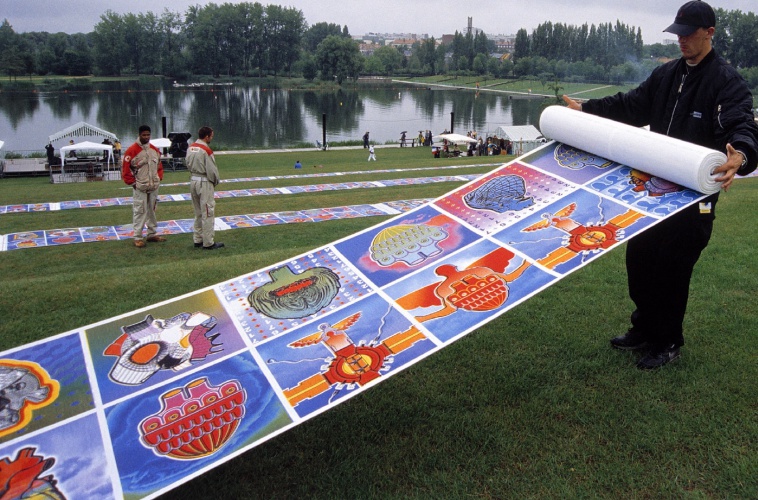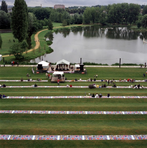 Commissioned by the Musée de Picardie, the twelfth Act of 70 x 7 The Meal took the form of an open-air picnic in the French city of Amiens’s in celebration of the Year of Mexico. The artists created a 1,500 metre picnic cloth, which was laid along the river banks in the Parc de Beauvillé. The cloth was designed into sections, to be cut and taken home at the end of the meal.