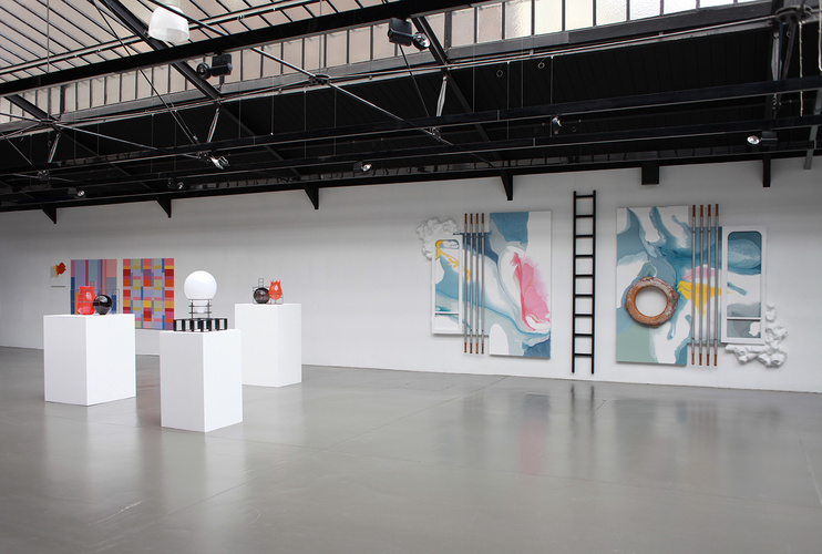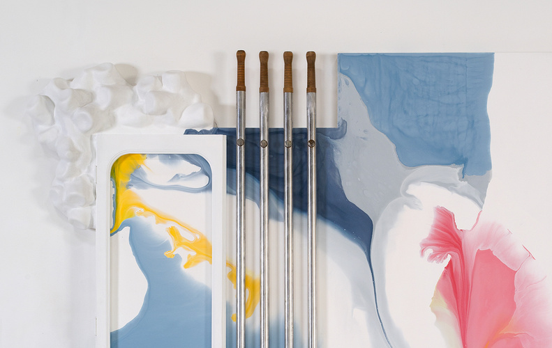 Here, the paintings on a wooden surface are combined with metaphorical objects that are part of the artists’ visual vocabulary —window frames, ladders, life rings, clouds, aluminium supports— like an assemblage that composes a new field of reflection with different levels of interpretation. These found objects are superimposed upon the gestural painting. They create lines and symmetries which structure and attempt to control the underlying chaos. They also open new horizons made possible by the use of window frames and life rings.
