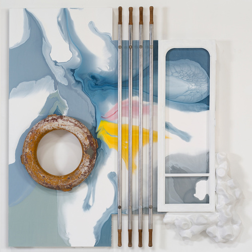 Polyurethane, wood, aluminium stretcher-bed bars, life ring, ladder, window frames, recycled water bottles, resin